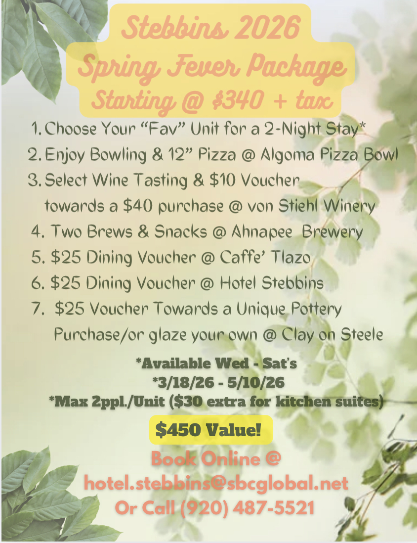 We often like to spice it up with fun packages and events that many times will include other great local businesses in Algoma as well. Check out this page often for updates on fun value packed offerings!!